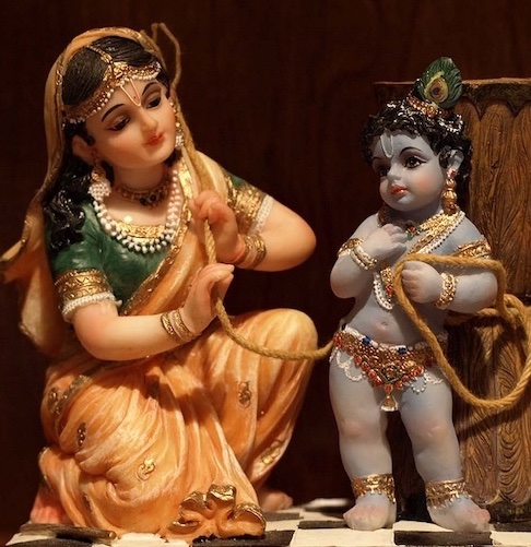 Yasoda Devi (left) ties up naughty Krishna to punish him for stealing butter. Mother Yasoda sees Krishna not as God but as her little boy, and Krishna relishes her natural motherly love. (Photo: Rasacharya Das)